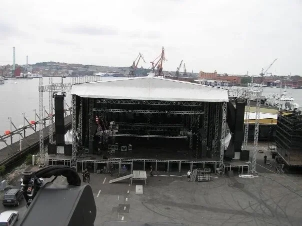 I mean the stages that rise from the ground like steel cathedrals, ton after ton of construction, cables, trusses, rigging, lights, and logistics.